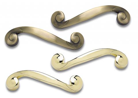 MANIGLIA ASIMMETRICA CON COPRI-VITE A PRESSIONE AD INCASTRO CM. 22,2 Finiture: Ottone antico Ottone lucido Fissaggio: Vite legno Codice: M40